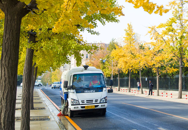 機洗(洗掃車洗掃吸一體)→機保(保潔車巡回保潔)→人沖(手持槍沖洗人行道)→人工(人工清掃保潔)